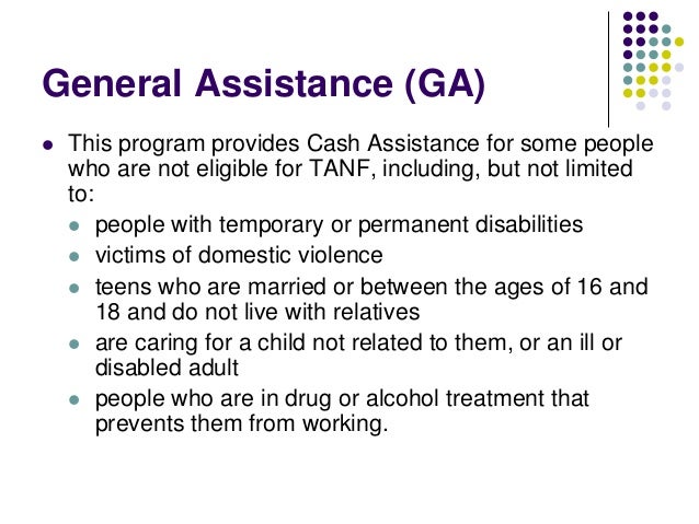 General Assistance (GA) Program. Fact. Sheet. What is the General Assistance (GA) program? The General Assistance Program provides limited state-funded cash assistance to adults without dependent children who are determined disabled and who are not eligible for assistance under a federally matched cash assistance program, such as Supplemental Security Income (SSI). ... Get Doc
